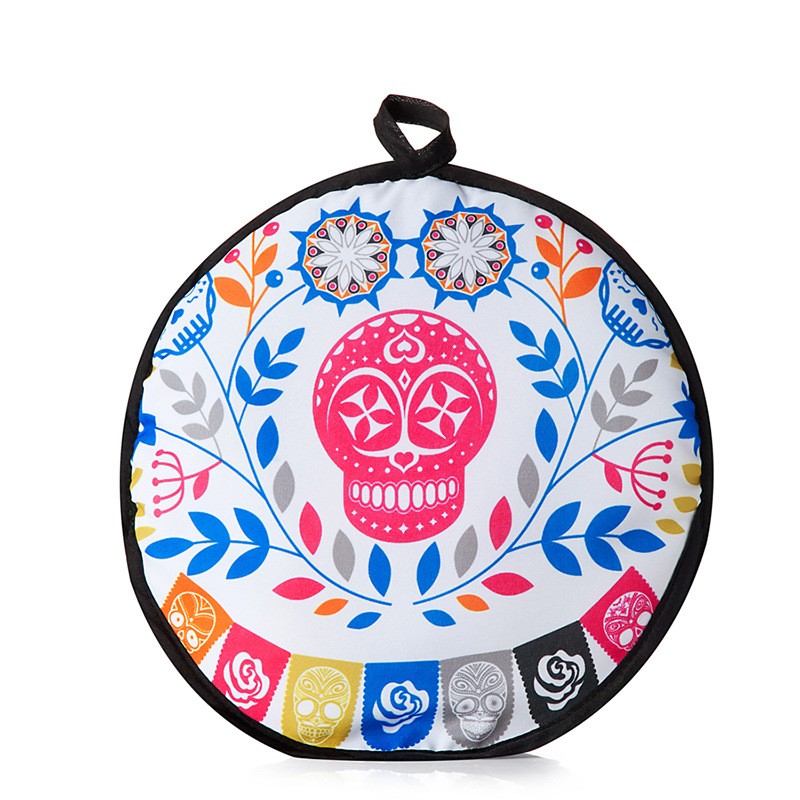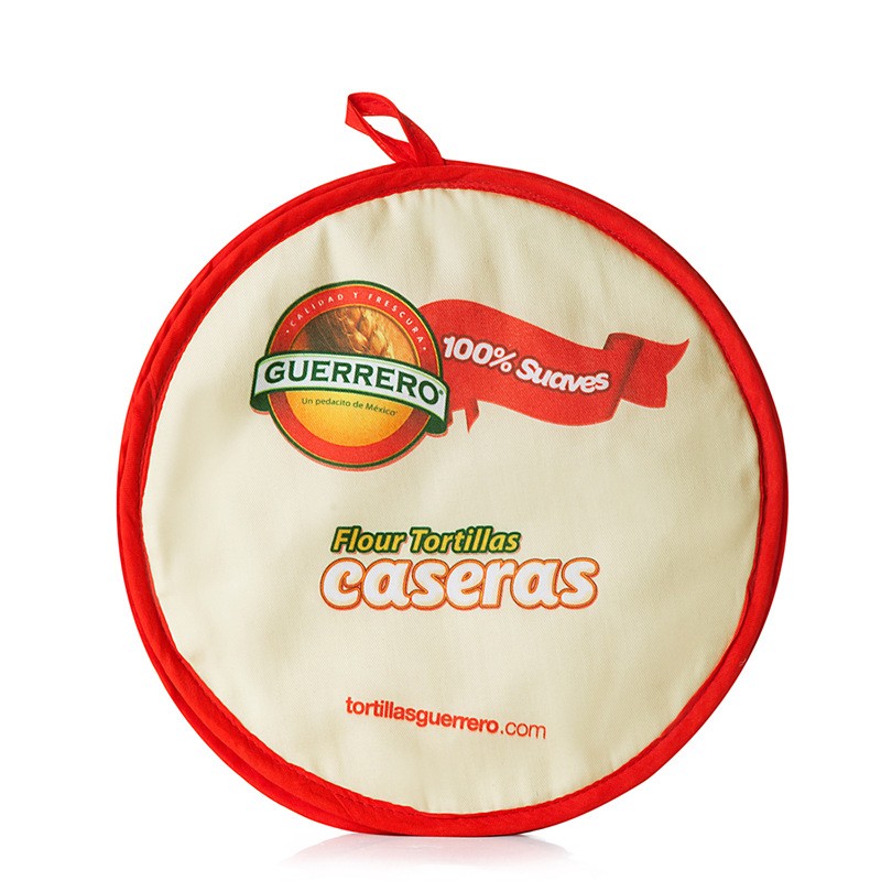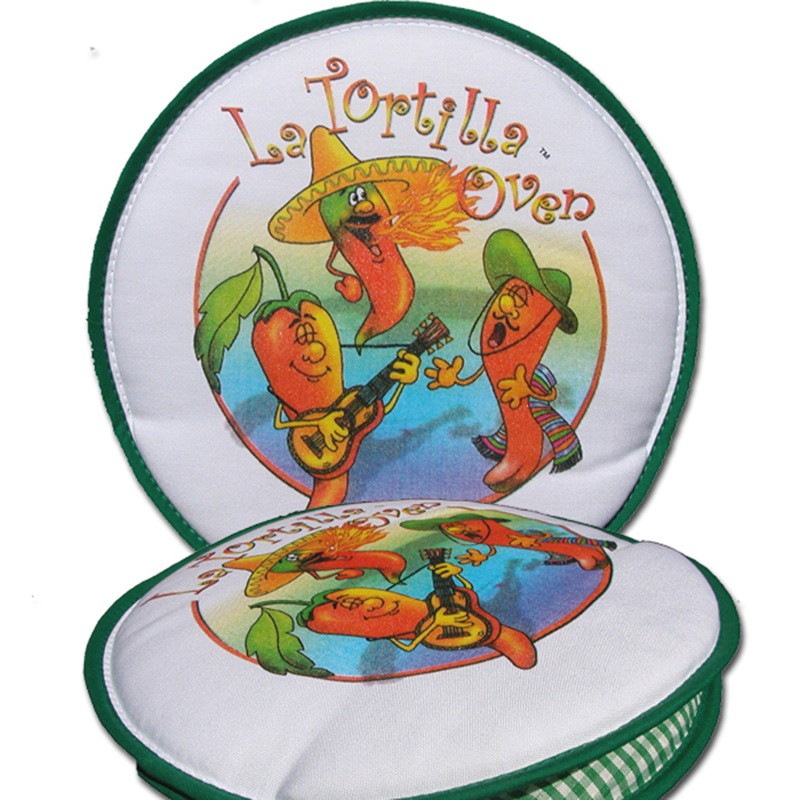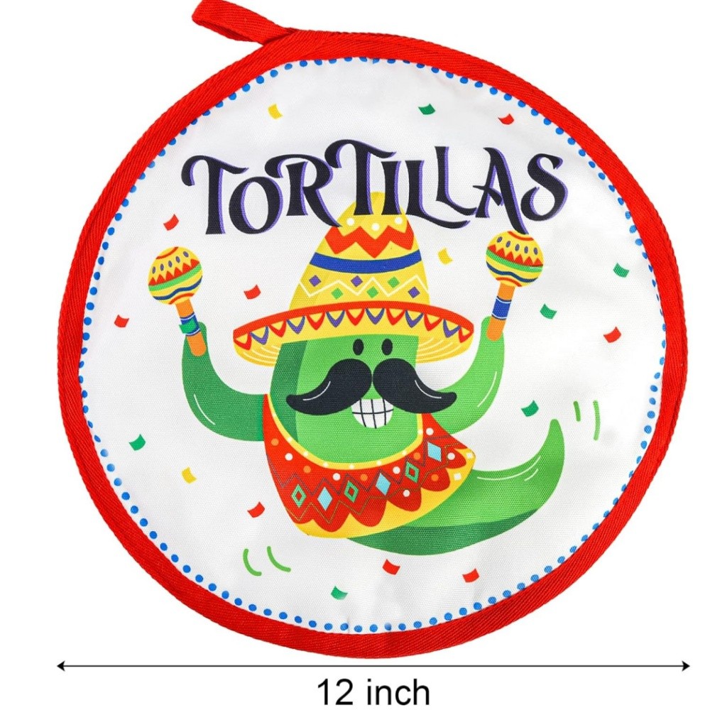 This tortilla warmer features a round design with a cloth exterior printed in traditional Mexican motifs. With a 12-inch diameter, it provides ample space for tortillas of all sizes and fits most standard and larger microwaves.