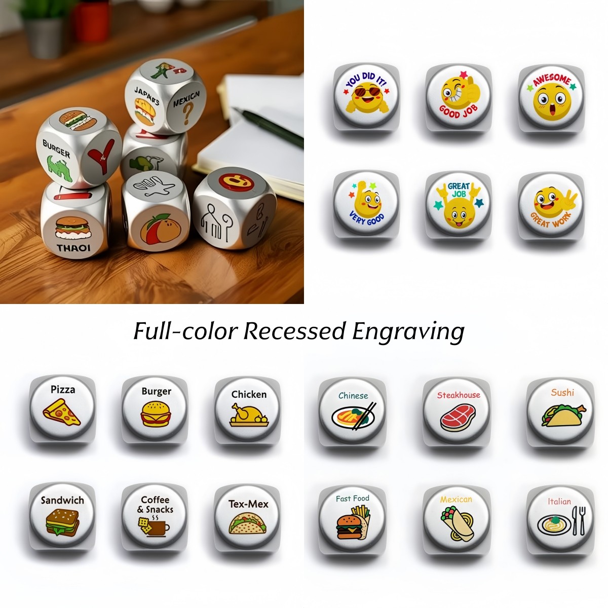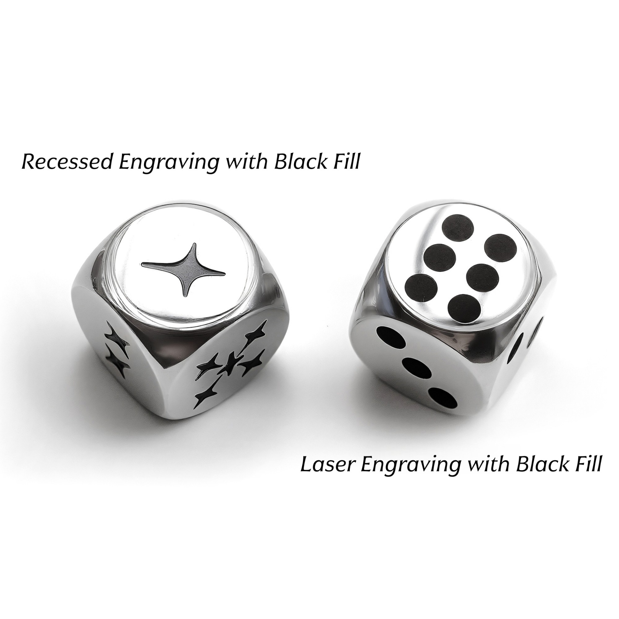 These premium 1.6cm (0.63") stainless steel dice combine durability with a sleek, modern design. Each die can be customized with logos or artwork using laser engraving with black fill or recessed engraving with black fill, creating a crisp, professional look. Optional full-color recessed engraving is also available upon request. The silver metal finish ensures a clean, high-end appearance that stands out on game tables, desktops, or as collectible items. Compact and versatile, these dice make ideal gifts for board game enthusiasts, collectors, corporate giveaways, or promotional events. Customization enhances brand visibility and adds a unique touch to every set.