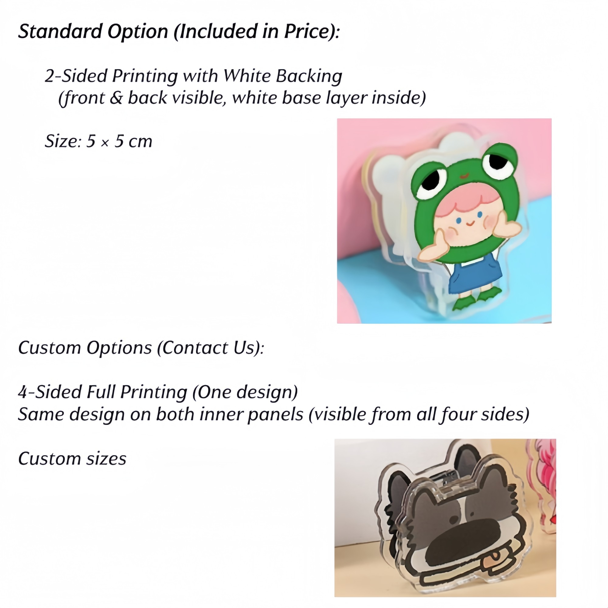 The standard option includes 2-sided printing with a white backing layer for solid color visibility. The reference size is 5 x 5 cm (1.97" x 1.97"), and custom sizes are available upon request.