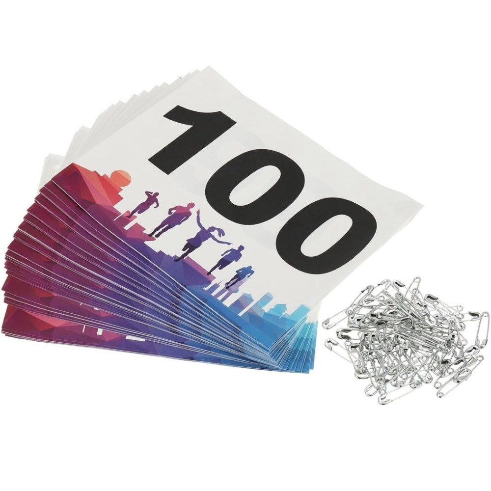 The race bibs are numbered from 1 to 100. Each tear-proof bib comes with a silver paper clip, allowing you to attach it securely to your clothing without the need for any additional accessories.