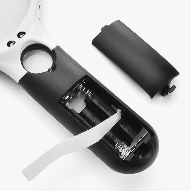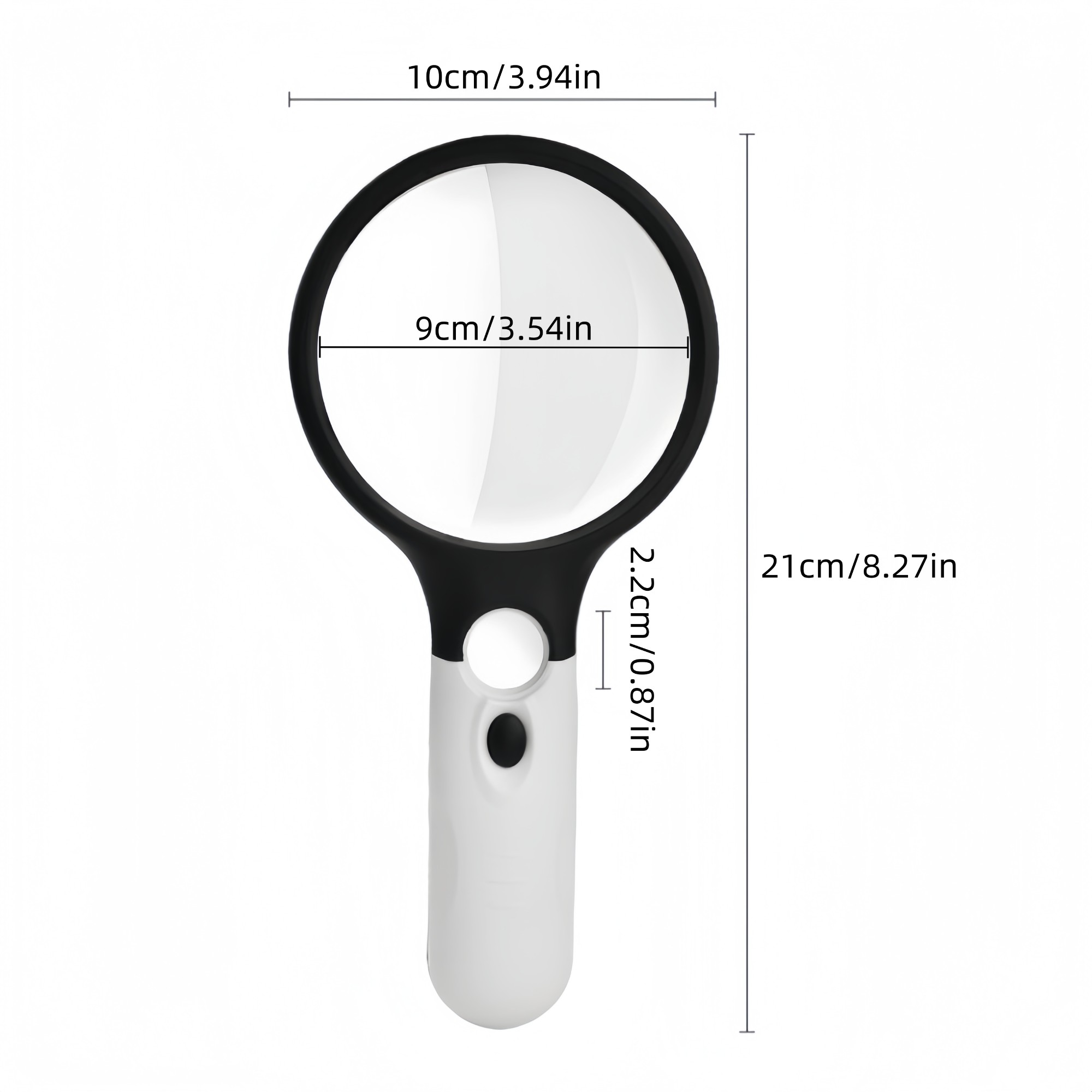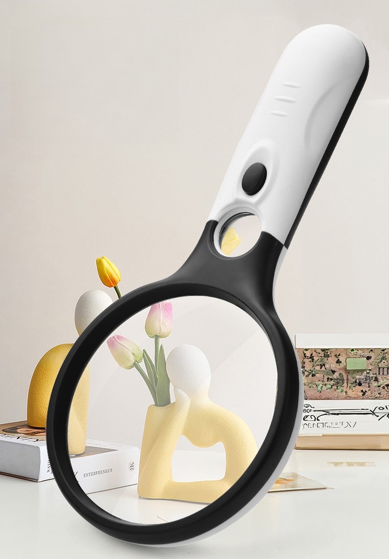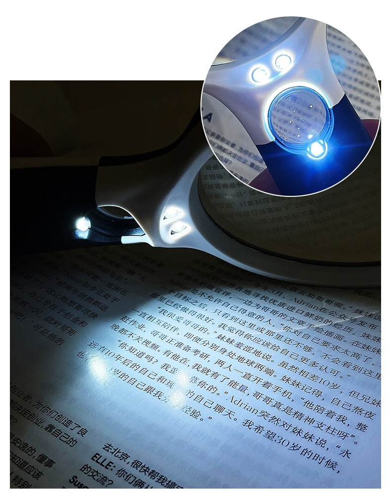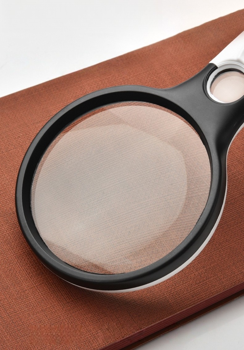 This battery-powered handheld magnifying glass features a large 9cm (3.54") clear glass lens for sharp, distortion-free viewing and a durable ABS housing for comfortable daily use. It also includes a small built-in spot lens for higher magnification when viewing extra-fine details. The built-in LED light provides bright, even illumination, helping you read small print and inspect fine details with ease. (Batteries not included.)
