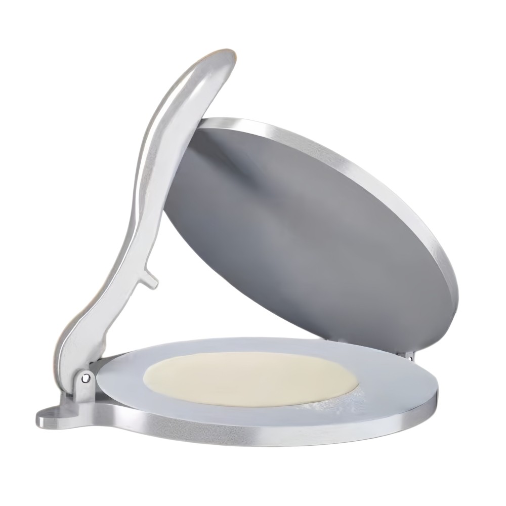 This manual aluminum dough press is designed to quickly and evenly shape dough for tortillas, flatbreads, and other homemade pastries.