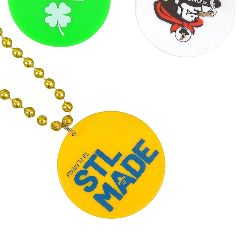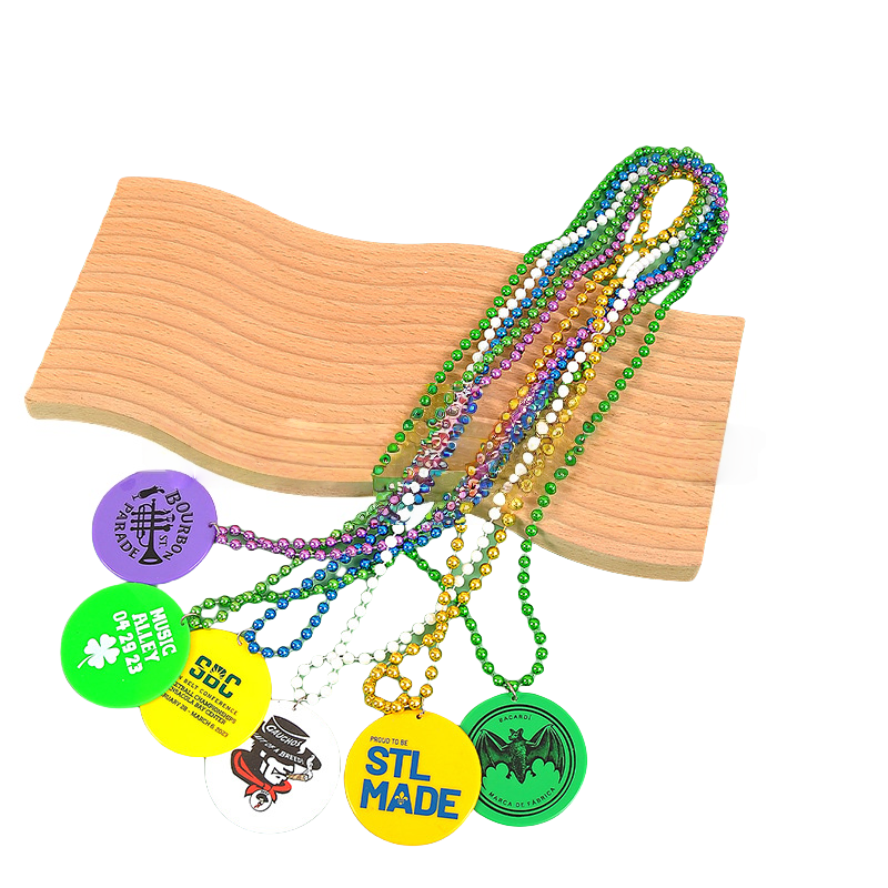 This premium promotional necklace features a clip-on medallion showcasing your logo in super sharp detail. Made with durable plastic beads designed for comfort, the strand slips effortlessly over your head.