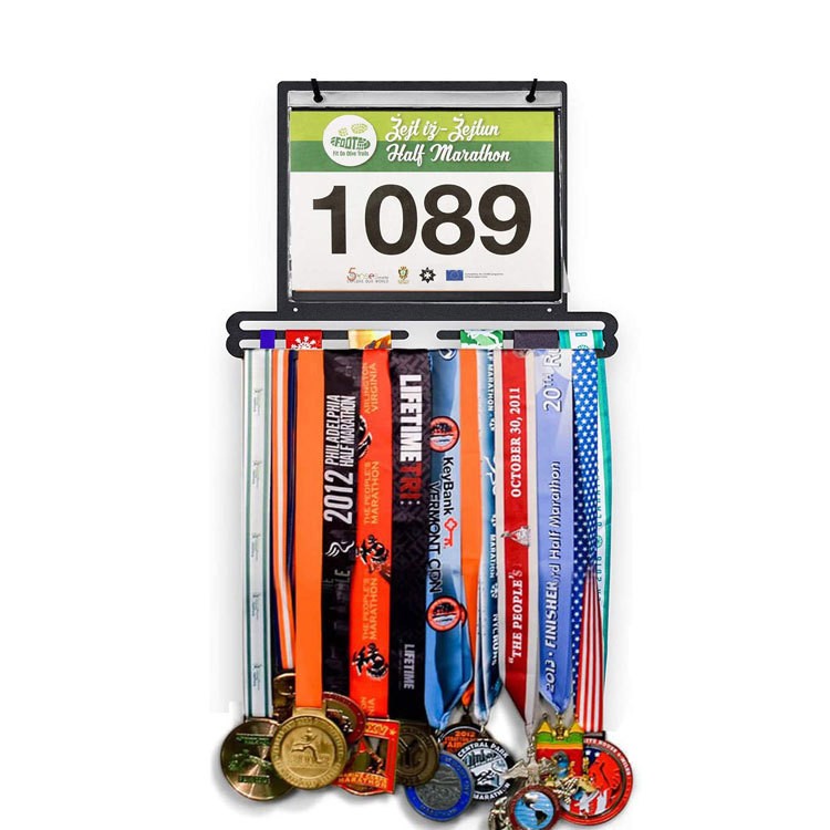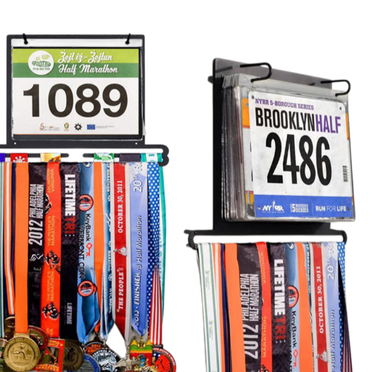 This display rack protects and elegantly presents your collection of bibs and medals from track and field events, 5Ks, road races, ultramarathons, and other sporting achievements. It is the perfect way to showcase your pride and permanently record your accomplishments.