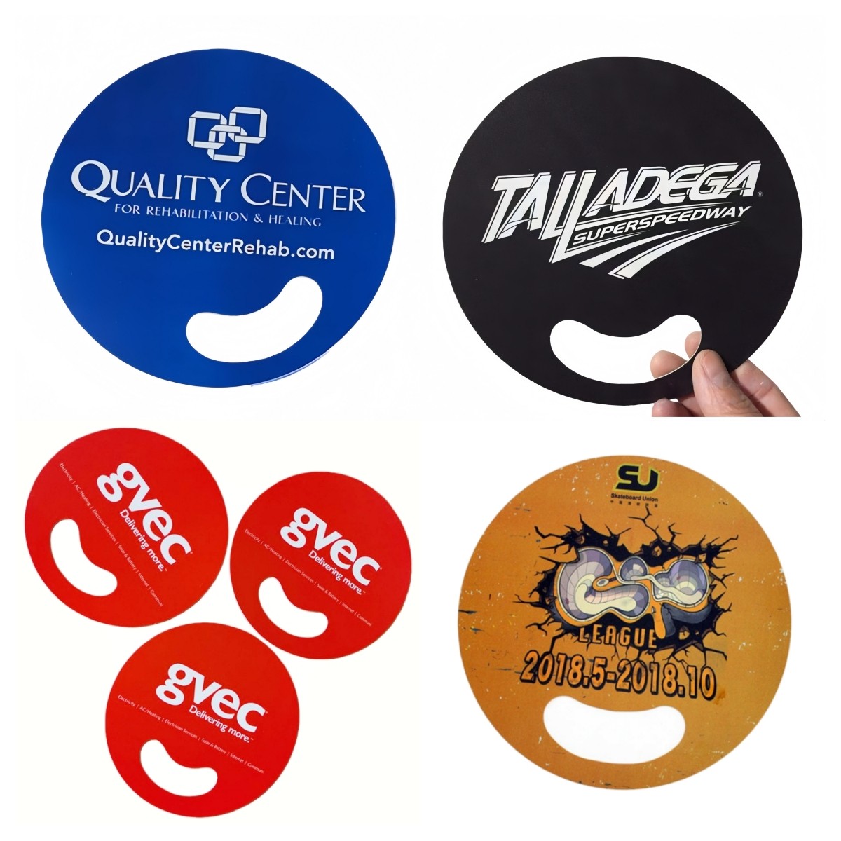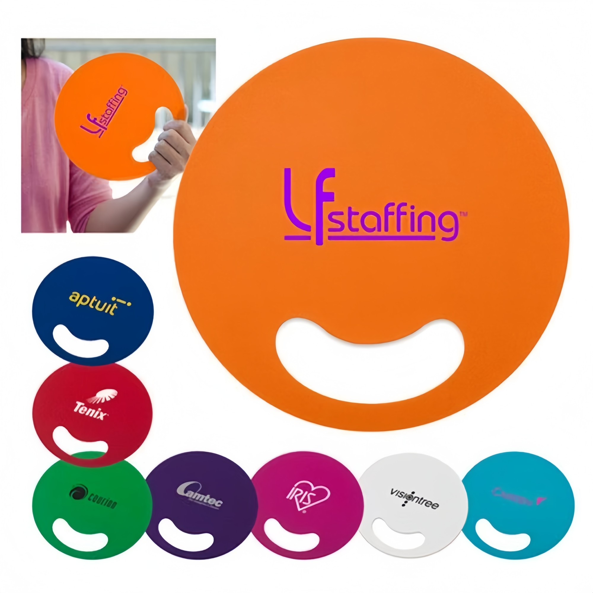 This round hand fan features a lightweight plastic design with a convenient center finger hole for easy grip and comfortable use. Its simple round shape creates a clean, eye-catching surface that is perfect for displaying logos, messages, or promotional artwork on both sides. Easy to wave and reusable, it offers instant cooling during outdoor events, trade shows, festivals, weddings, parades, and sporting activities. The compact, flat design makes it easy to carry, distribute, or store in bulk. A practical and cost-effective promotional item that combines everyday function with high visibility for brand exposure.