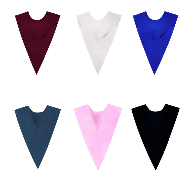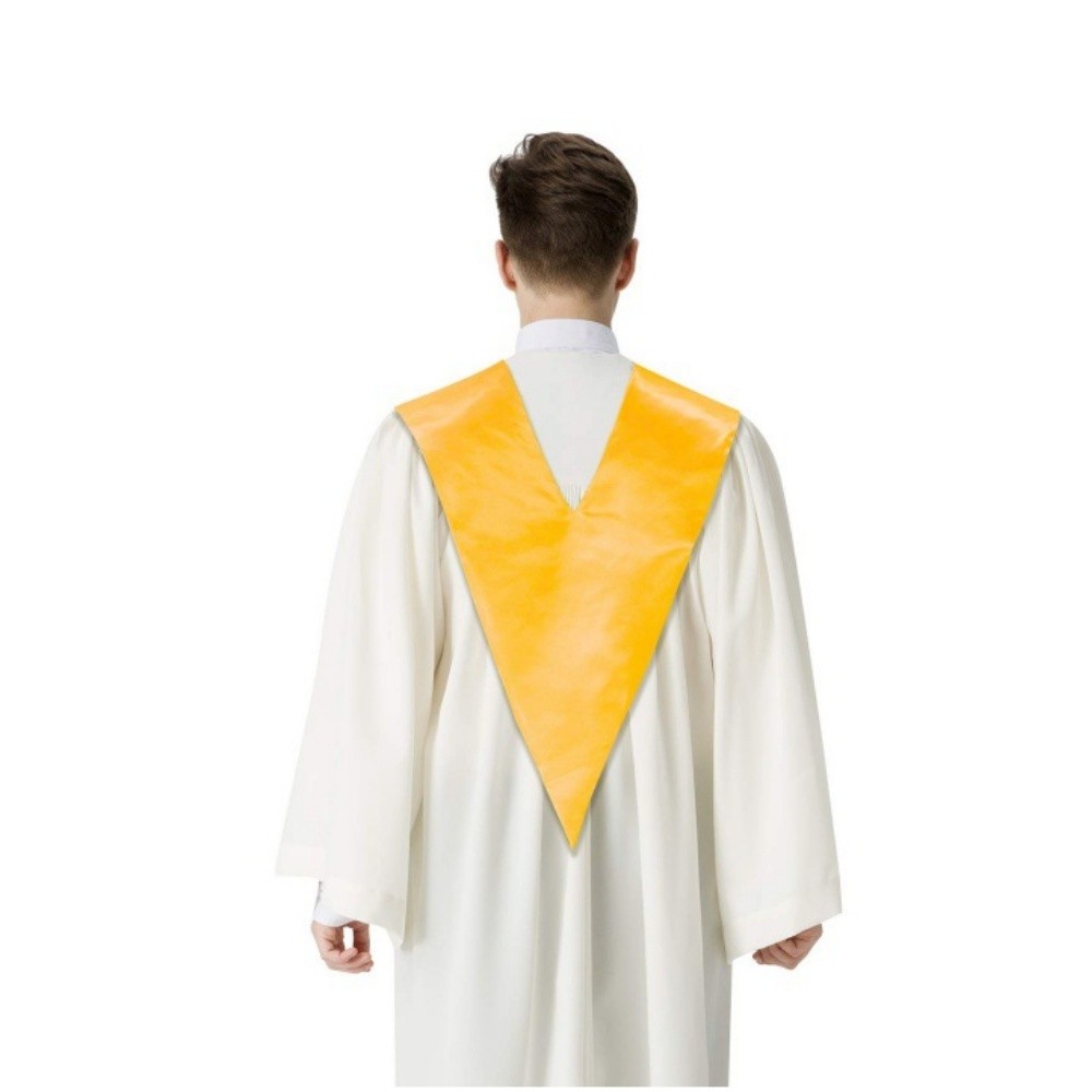 This choir stole is made of high-quality polyester shiny satin fabric. It is strong yet smooth to the touch, offering both durability and comfort. Designed with a classic V-shaped front and arrow-pointed edges, it flatters all body types and adds a touch of elegance to any graduation dress or choir robe.