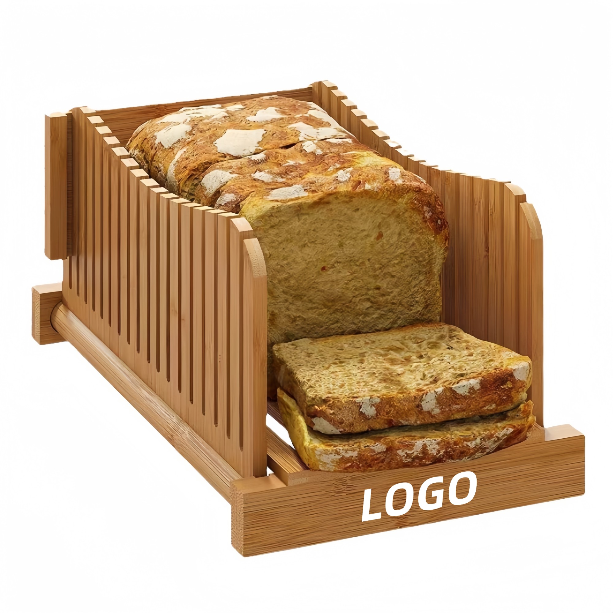 Upgrade your bread-slicing routine with this beautifully crafted bamboo bread slicer. Made from high-quality, eco-friendly bamboo, this sturdy slicer ensures uniform slices every time, making it perfect for homemade bread, toast, or cakes. This bread slicer offers customizable branding with two logo printing options: laser engraving for a sleek, engraved look or color painting for a vibrant design. Ideal for personal use, gifts, or corporate branding, this versatile product blends practicality and style. Its easy-to-use, foldable design allows for convenient storage, while the adjustable guide ensures precise, even cuts every time. Whether you're a home baker or a kitchen enthusiast, this bread slicer will quickly become an essential tool in your kitchen.